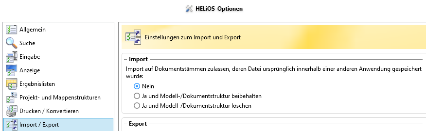 In den HELiOS Optionen des HELiOS Desktop können Sie als Administrator unter Import / Export einstellen, ob der Import von HiCAD-Dokumenten auf Dokumentstämme mit Dokumentstruktur zugelassen wird: