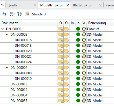 Die Modellstruktur wiederum zeigt die Dokumentstruktur von HiCAD-Dateien (.SZA, .KRA) an. D. h. sie stellt diejenigen Dokumentstämme dar, die von dem entsprechenden SZA-/ KRA-Dokument referenziert wurden.