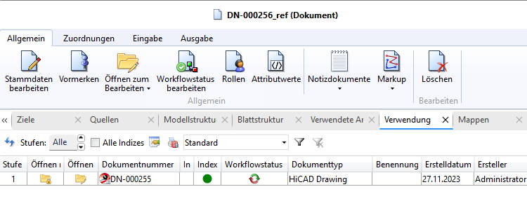 Durch die Speicherung der Modell-/ Dokumentstruktur von SZA-/ KRA-Dateien lässt sich auch der Dokumentverwendungsnachweis (im Reiter Verwendung auf dem Dokumentstamm) nutzen.