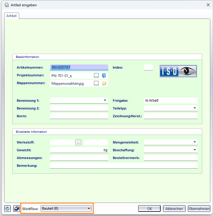 Ist die Checkbox aktiv und hat das angeklickte Teil keinen Artikelstamm, dann wird automatisch das Dialogfenster Teileattribute angezeigt.