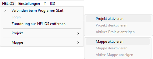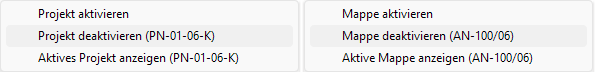 Ist ein Projekt bzw. eine Mappe aktiv, dann lässt sich über das Menü das Projekt / die Mappe deaktivieren, der Projekt-/Mappeninhalt anzeigen sowie ein anderes Projekt / eine andere Mappe aktivieren.