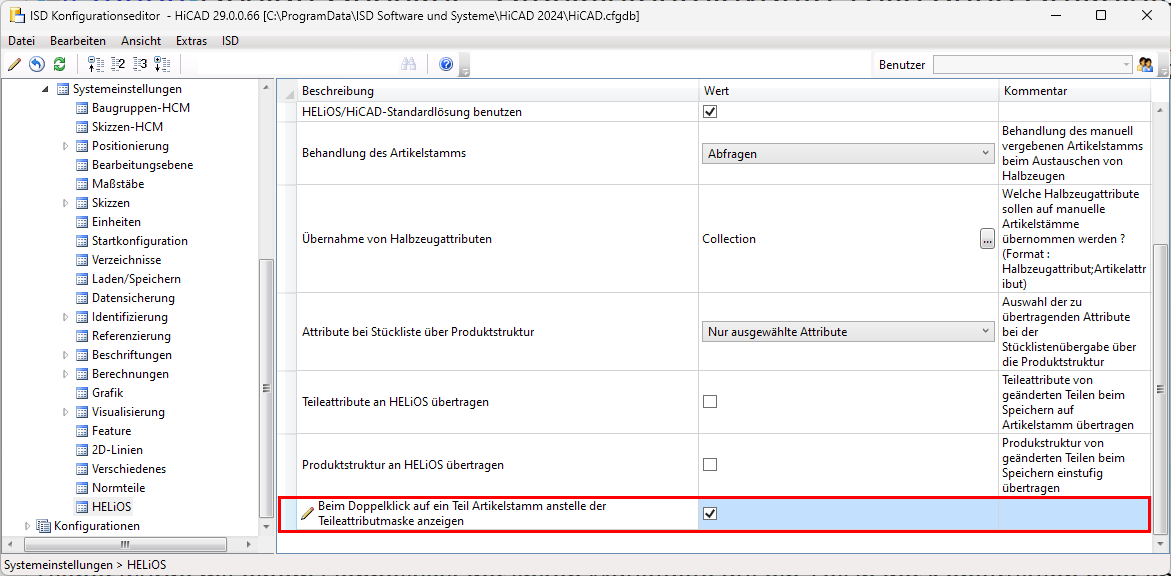 Bisher wurde mit einem Doppelklick der linken Maustaste auf ein Teil in der Konstruktion oder im ICN das Dialogfenster Teileattribute aufgerufen. Ab HiCAD 2024 kann nun beim Einsatz von HELiOS alternativ der Artikelstamm des Teils angezeigt werden. Dies lässt sich im Konfigurationsmanagement unter Systemeinstellungen > HELiOS einstellen.