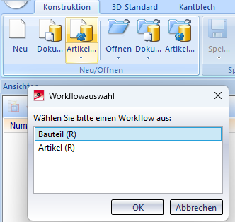 In früheren HiCAD-Versionen erschien beim Aufruf von Neukonstruktionsfunktionen wie z. B. Neukonstruktion mit Datenbank, mit neuem Artikelstamm