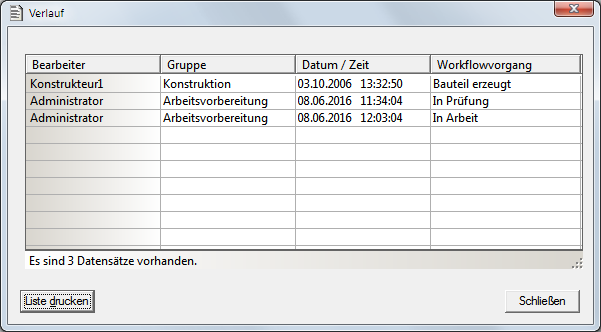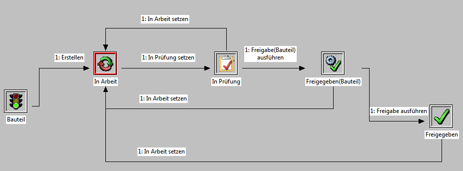 Mit den Workflow-Funktionen lässt sich der Workflowstatus des Dokument- und Artikelstammes der aktiven Konstruktion bzw. des aktiven Teils anzeigen und bearbeiten.
