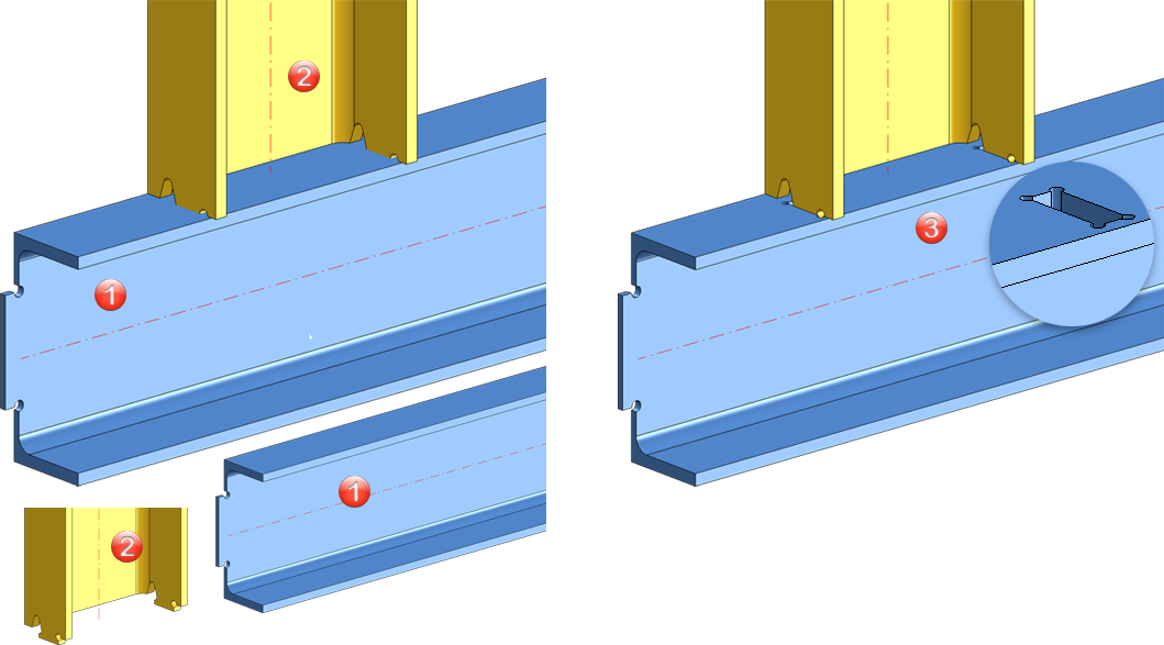 Der Luftspalt bestimmt den Abstand zwischen der Durchdringung und dem Kollisionsteil. Im folgenden Beispiel wird ein Hohlprofil von zwei anderen Hohlprofilen durchdrungen. (1) zeigt das Ergebnis ohne, (2) das mit Luftspalt.