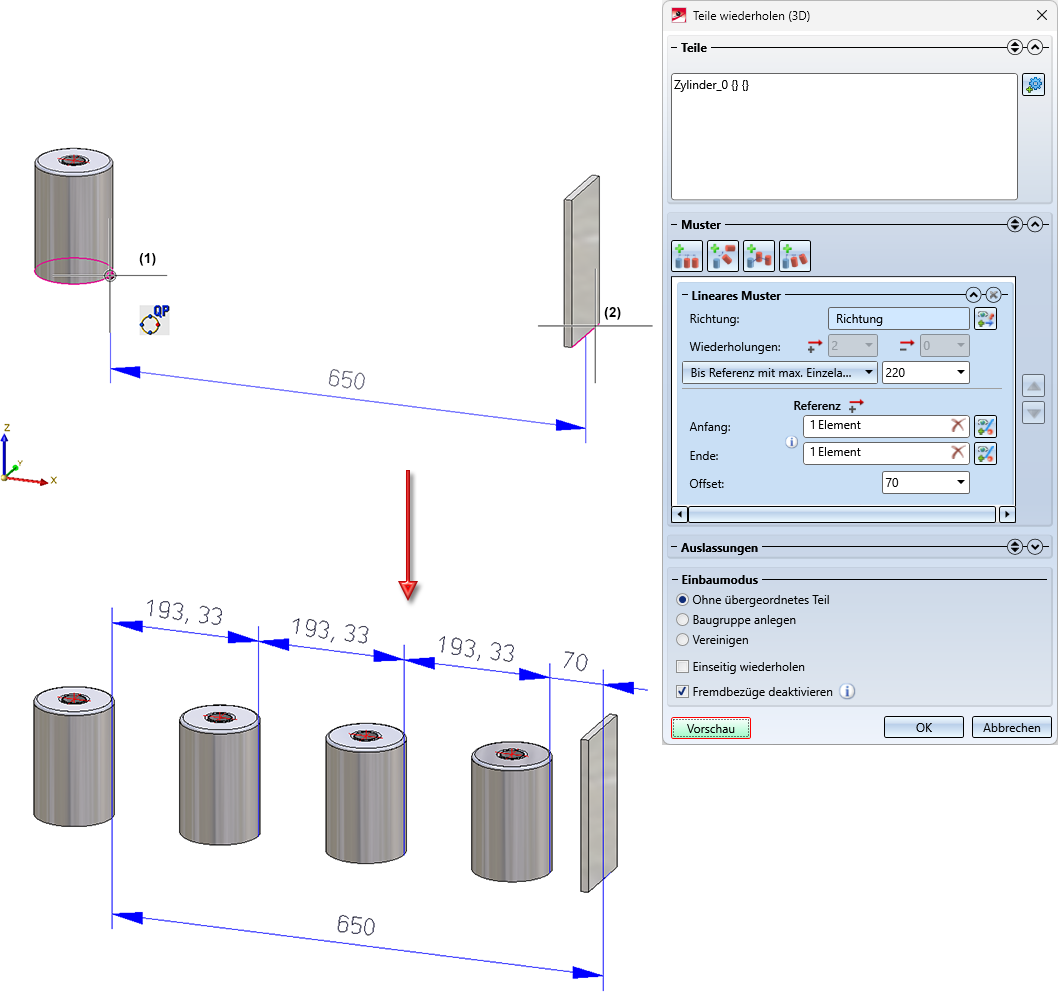 Hier wird der Abstand zwischen dem Original und der letzten Wiederholung durch den Abstand zweier Referenzelemente bestimmt. Die Anfangsreferenz muss ein Punkt sein, die Endreferenz ein Punkt, eine Kante oder eine Fläche. Die Anzahl der Wiederholungen wird dann anhand des eingegebenen Abstandes und des ermittelten Referenzabstandes automatisch ermittelt. Zusätzlich kann hier ein Offset für die letzte Wiederholung angegeben werden. Deren Abstand von der gewählten Endreferenz ist dann die Summe aus angegebenem Abstand und Offset.