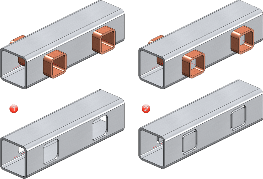Der Luftspalt bestimmt den Abstand zwischen der Durchdringung und dem Kollisionsteil. Im folgenden Beispiel wird ein Hohlprofil von zwei anderen Hohlprofilen durchdrungen. (1) zeigt das Ergebnis ohne, (2) das mit Luftspalt.