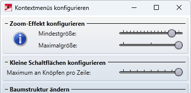Die Defaulteinstellungen des Kontextmenüs beim ersten Start von HiCAD sind geändert worden. Die Regler für die Maximalgröße der Icons und das Maximum an Icons pro Zeile werden jetzt auf das Maximum gestellt. Der Regler für die Mindestgröße der Icons wird automatisch anhand der Auflösung des Bildschirms und dessen Skalierung bestimmt.