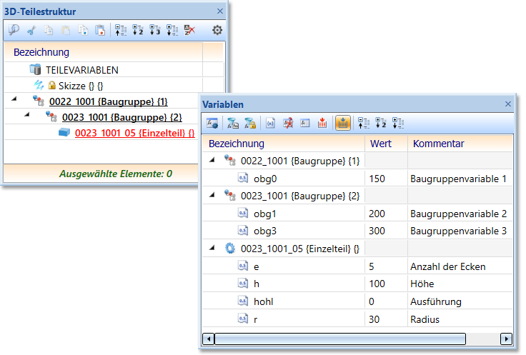 Werden die Teileart bzw. der Teiletyp und die Positionsnummer im Andockfenster 3D-Teilestruktur des ICN angezeigt, erfolgt ab SP2 eine entsprechende Anzeige auch im Andockfenster der Variablen.