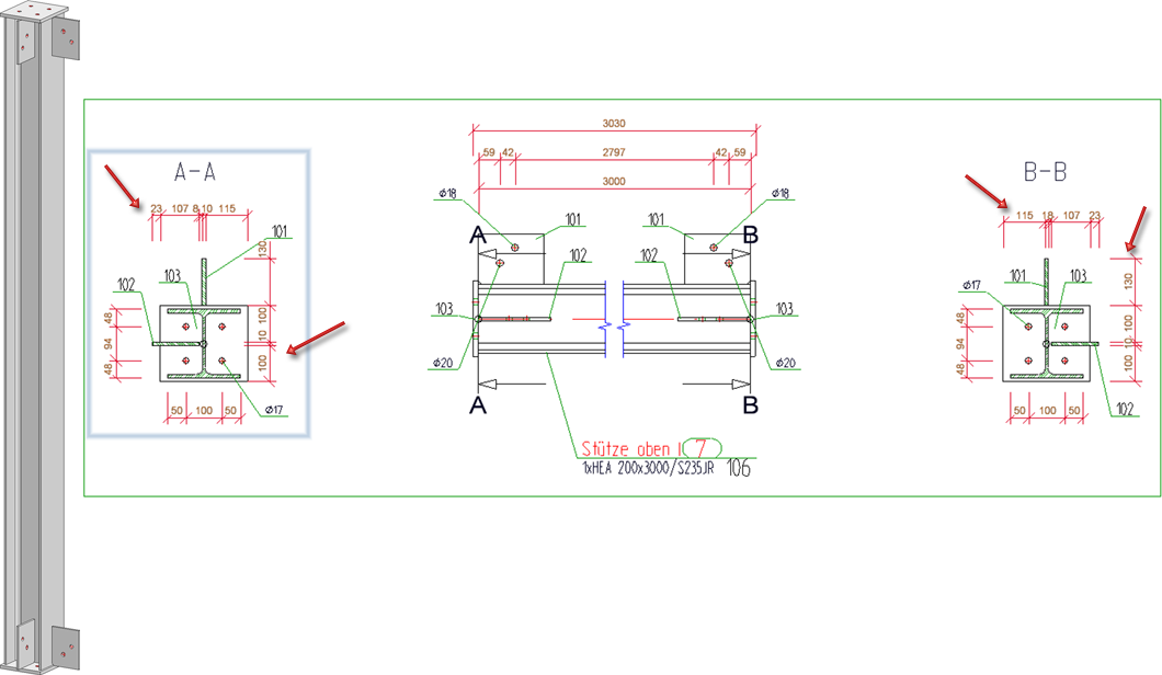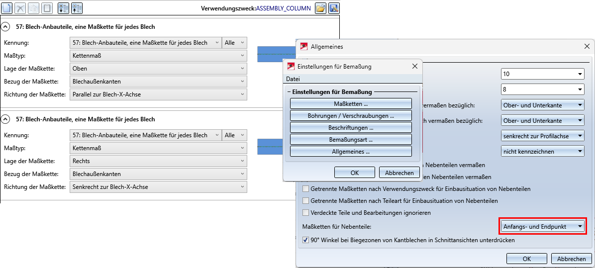 Bisher ist bei der Zeichnungsableitung mit automatischer Bemaßung (Bemaßungsregeln) immer nur die Lage des Profils zum Nebenteil bemaßt worden. Ab HiCAD 2024 wird die Lage aller Nebenteile bemaßt. Die Bemaßungsregeln
