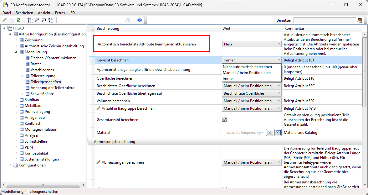 Im Konfigurationsmanagement lässt sich unter Modellierung > Teileeigenschaften festlegen, wann bestimmte Attribute und Abmessungen berechnet werden sollen. Dies gilt beispielsweise für das Gewicht, das Volumen, die Oberfläche u.v.m. Dies kann beispielsweise immer, d. .h. nach jeder Änderung eines Teils, manuell bzw. beim Positionieren erfolgen.