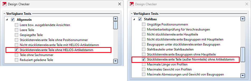 Im Design Checker steht unter Allgemein ein neuer Test zur Verfügung, der alle Teile/Baugruppen sucht, die stücklistenrelevant sind, aber keinen HELiOS Artikelstamm besitzen. Im Unterschied zum bisherigen Test unter Stahlbau werden hier auch Normteile berücksichtigt.