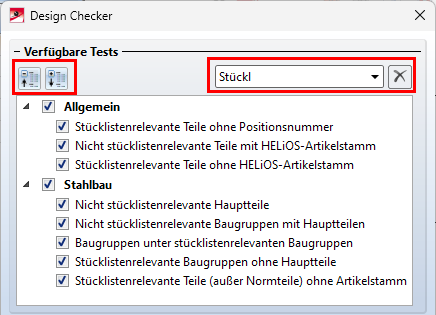 lassen sich alle Testgruppen in einem Schritt auf- bzw. zuklappen. - Wenn Sie in das Suchfeld einen Suchbegriff eingeben, listet HiCAD alle Tests auf, deren Name den angegebenen Suchbegriff enthält.