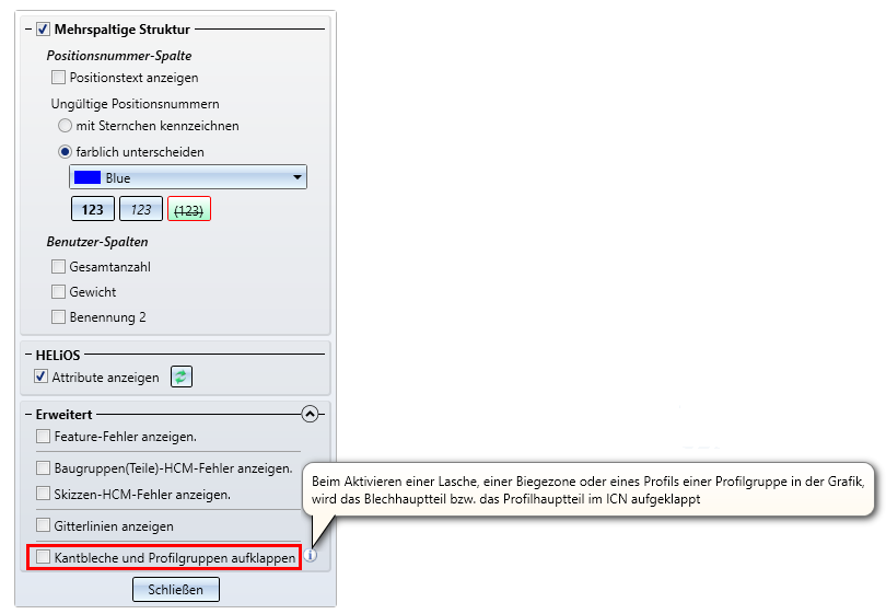 Ist in den ICN-Einstellungen die Checkbox inaktiv, dann wird bei Auswahl der Lasche des einen Kantbleches die Struktur nicht aufgeklappt.