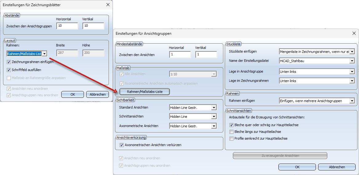 ist aus dem Menü Konstruktion > Positionierung/Detaillierung > Zeich... entfernt und in den Dialog der automatischen Zeichnungsableitung integriert worden. Dort lässt sich jetzt im Dialogfenster Zeichnungsblätter unter Rahmen die Option Rahmen/Maßstabs-Liste wählen. Ist die Option gewählt, dann kann im Dialogfenster Ansichtsgruppen mit der Schaltfläche Rahmen/Maßstabs-Liste der entsprechende Dialog gestartet werden.