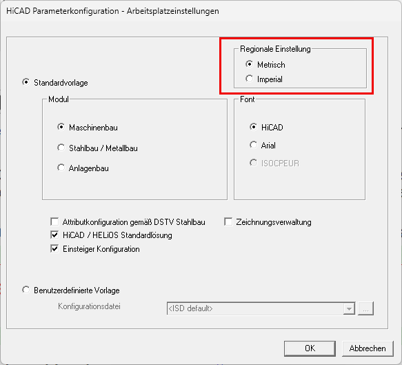 Mit dem Tool ParKonfigComp.exe können Sie wählen, ob Sie beim Arbeiten mit HiCAD die ISD Standardkonfigurationen oder eigene Konfigurationen verwenden wollen. Insbesondere können Sie hier festlegen, in welcher oder für welche Region - Nordamerika (imperial) oder Europa (metrisch) - Sie arbeiten. Die Wahl der Region betrifft die Maßeinheiten der Konstruktion, Maßstäbe und Zeichnungsrahmen.