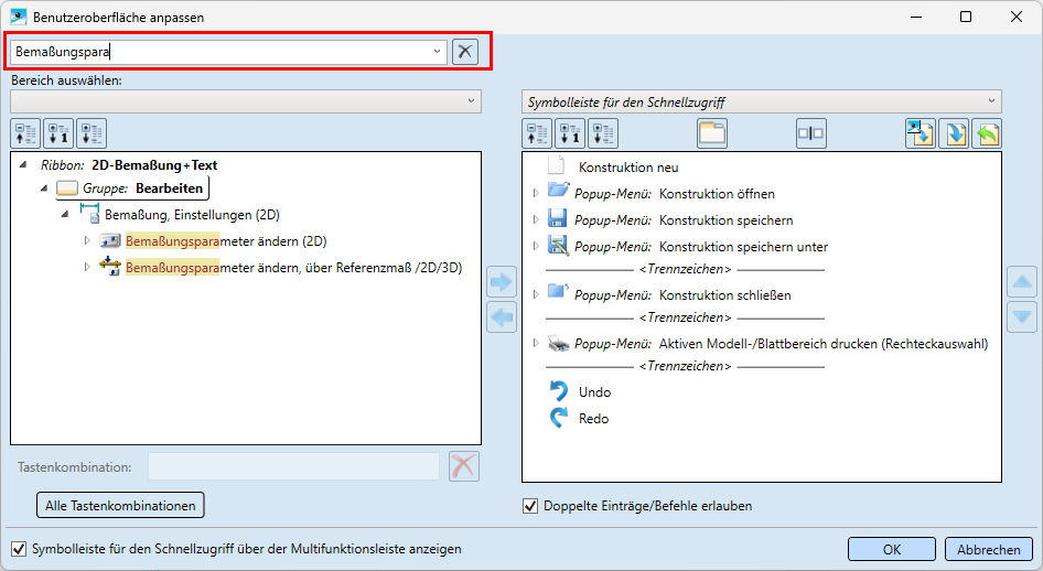 HiCAD bietet ein sehr umfangreiches Funktionsspektrum. Wenn Sie beim Anpassen der Schnellzugriffsleiste oder beim Anlegen neuer Ribbon-Leisten eine bestimmte Funktion suchen, aber nicht mehr genau wissen, auf welchem Ribbon die Funktion zu finden ist, kann ab SP2 das Suchfeld Abhilfe schaffen. Wenn Sie hier einen Suchbegriff eingeben, listet HiCAD alle Funktionen auf, deren Name den angegebenen Suchbegriff enthält. Gesucht wird dabei in allen Ribbon-Leisten sowie in der transparenten Symbolleiste.