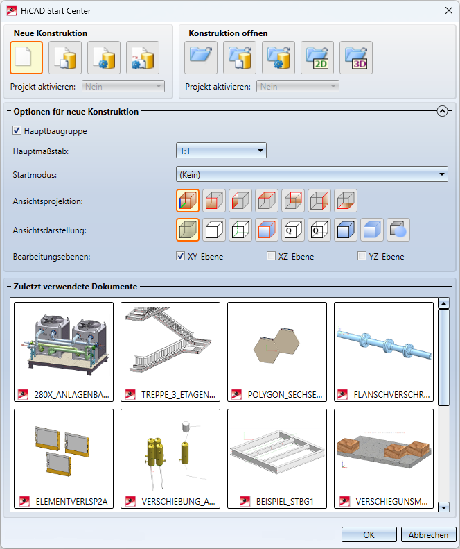 Das HiCAD Start Center wurde neu und benutzerfreundlicher gestaltet, wobei die Funktionen größtenteils unverändert blieben. Unter Neue Konstruktion finden Sie nun die vier Funktionen zur Erstellung einer neuen Konstruktion. Unter Konstruktion öffnen finden Sie alle Funktionen zum Öffnen und Importieren von Konstruktionen und Zeichnungen.Die Icons für Neue Konstruktion und Konstruktion öffnen können mit einem Doppelklick ausgeführt werden. Diese Funktionen finden Sie auch in der Registerkarte Konstruktion > Neu/Öffnen. Unter Optionen für neue Konstruktion finden Sie wie gewohnt die Einstellmöglichkeiten für eine neue Konstruktion. Als neue Funktion wurde Zuletzt verwendete Dokumente hinzugefügt. Hier können Sie die letzten 16 geöffneten Konstruktionen als Vorschau sehen und mit einem Klick direkt öffnen. Die Größe der Vorschaubilder kann nicht angepasst werden.