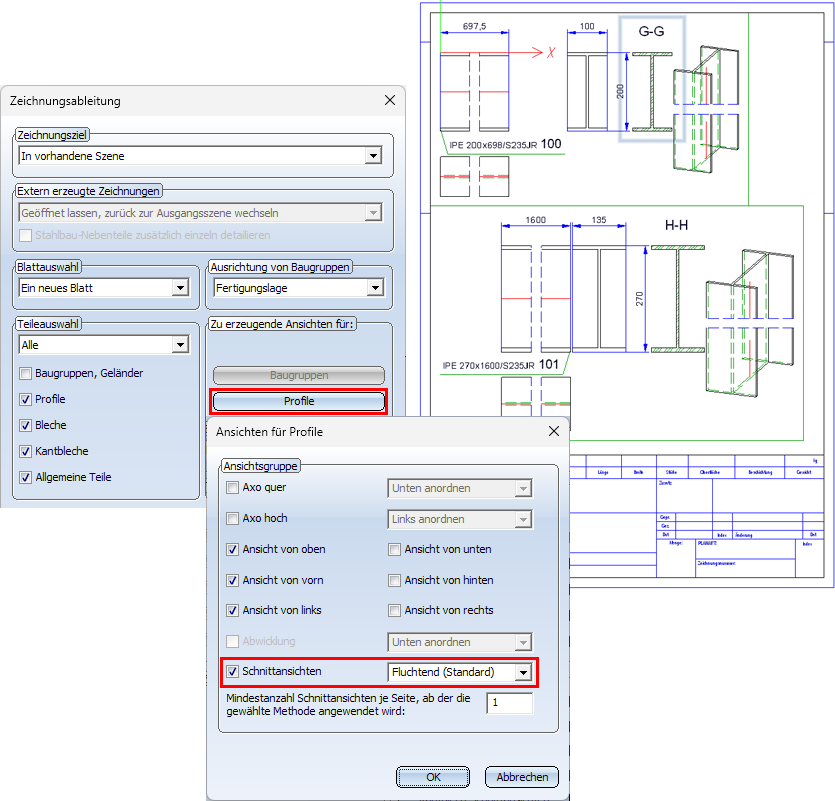 Alte Werkstattzeichnungen (vor HiCAD 2024 SP1) bleiben bei der Aktualisierung ohne Ansicht des Profilquerschnitts.