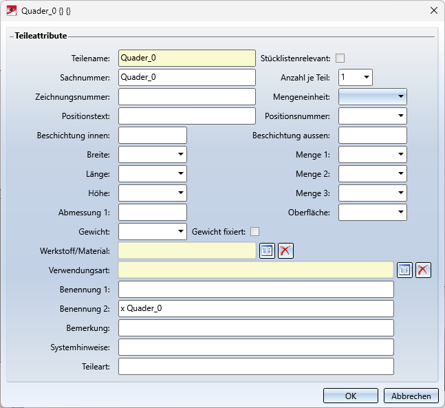 Einige der Attribute werden direkt beim Anlegen von Konstruktionen oder beim Einbau von Teilen und Baugruppen automatisch zugeordnet. Andere lassen sich mit den Funktionen Konstruktionsattribute bzw. Attribute des Teils (Kontextmenü der Konstruktion bzw. des Teils) zuweisen. Dazu wird das Dialogfenster Konstruktionsattribute bzw. Teileattribute angezeigt. Der Inhalt des Dialogfensters hängt dabei vom gewählten Teil (z. B. Baugruppe, 3D-Teil, Kantblech, Profil, Rohrleitung etc.) sowie von der Parameterkonfiguration (Maschinenbau, Stahl-/Metallbau, Anlagenbau, DSTV, Zeichnungsverwaltung) ab.