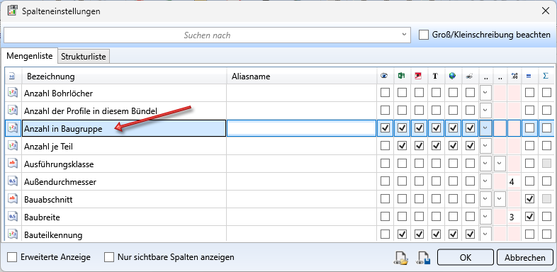 Dieser Wert legt fest, um wie viel Grad die Achse eines Profils von der unter Ausrichtung für Stützen gewählten Achse abweichen darf, damit das Profil immer noch als Stütze gilt. (Default 0) - Neben dem Attribut Anzahl je Teil steht das Teileattribut Anzahl in Baugruppe zur Verfügung (nicht standardmäßig im Attributdialog). Darüber lässt sich ermitteln, wie oft das Teil in der Baugruppe vorhanden ist. Dabei wird nur die aktuelle Baugruppenstufe berücksichtigt. Beachten Sie, dass die Ermittlung dieses Wertes von den Einstellungen im Konfigurationsmanagement unter Modellierung > Teileeigenschaften > Anzahl in Baugruppe berechnen abhängt.