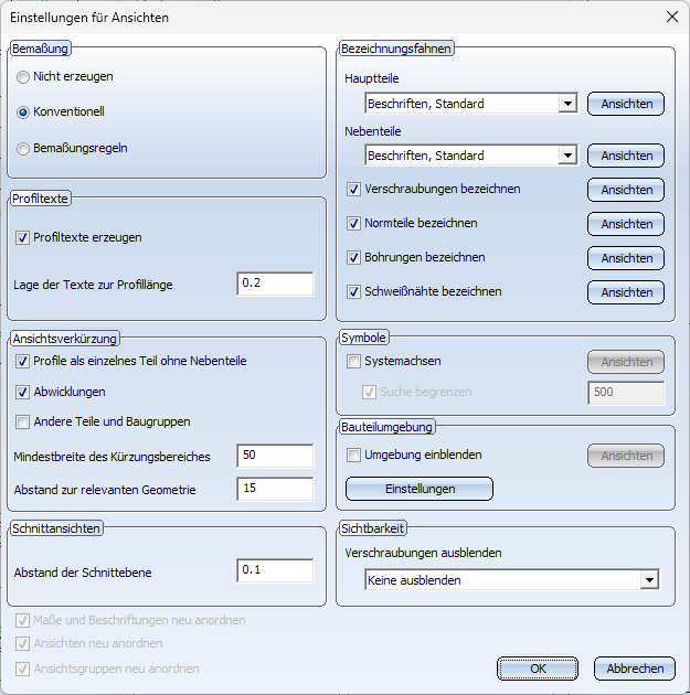 Die Sichtbarkeit kann hier getrennt für Standard-Ansichten, Schnittansichten und axonometrische Ansichten festgelegt werden. Die Defaultwerte sind: