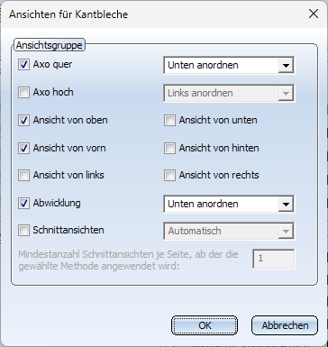- Für Kantbleche lassen sich darüber hinaus Abwicklung und Schnittansichten darstellen. Dazu müssen die entsprechenden Checkboxen aktiviert werden.