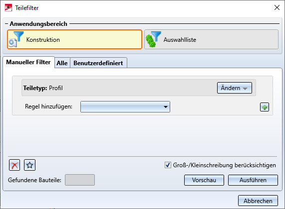 Damit steht Ihnen ein komfortables Werkzeug zur Auswahl von Bauteilen zur Verfügung.Beispielsweise können Sie gezielt nach bestimmen Profilen oder Blechen suchen und nur für diese die Zeichnungen aktualisieren bzw. erstellen.