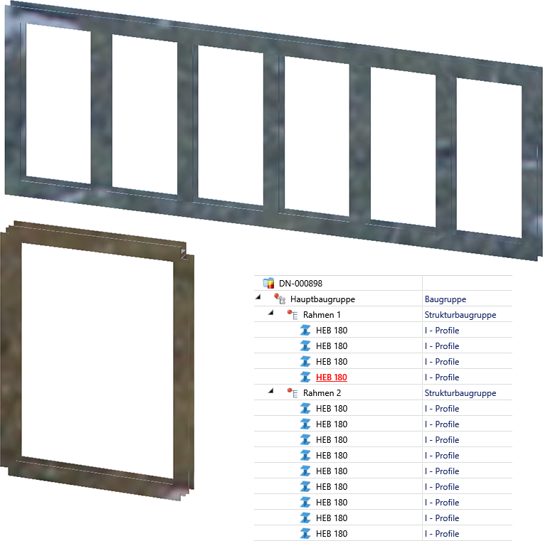 Die Konstruktion besteht aus zwei nicht stücklistenrelevanten Strukturbaugruppen mit mehreren I-Profilen. Die Baugruppen Rahmen 1 und Rahmen 2 sind in diesem Beispiel die Bauabschnitte.