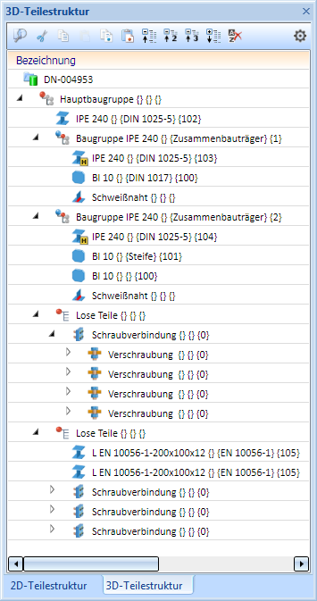 Sie können sich nun im HELiOS Desktop die aktuellen Verknüpfungen und die Produktstruktur anzeigen lassen, z. B.im Projektexplorer durch Öffnen des Dokumentes mit dem 3D-Modell. Damit können Sie feststellen, welche Teile positioniert sind und ob zu den Teilen bereits eine Zeichnung existiert. Die Abbildung zeigt, dass noch keine Zeichnungen vorhanden sind.