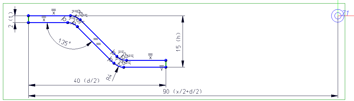 Durch die Lagebedingungen ist die Skizze komplett definiert. Die verwendeten Variablen haben dabei folgende Bedeutung: t der Wert ist 2 steht für die Dicke des zu bearbeitenden Blechs, h der Wert ist 15 steht für die Höhe der Sicke und d der Wert ist 80 für die Breite. Nutzen Sie die Funktionen Abstand parallel zur X-Achse  und Abstand parallel zur Y-Achse  aus dem Bereich Skizze > HCM, um die Skizze zu bemaßen. Geben Sie anstelle der Werte die Variablen t, h und d ein. Daraufhin erfolgt eine Wertabfrage für die Variablen. Bei der Bemaßung muss für die Breite d/2 anstelle von d eingegeben werden.