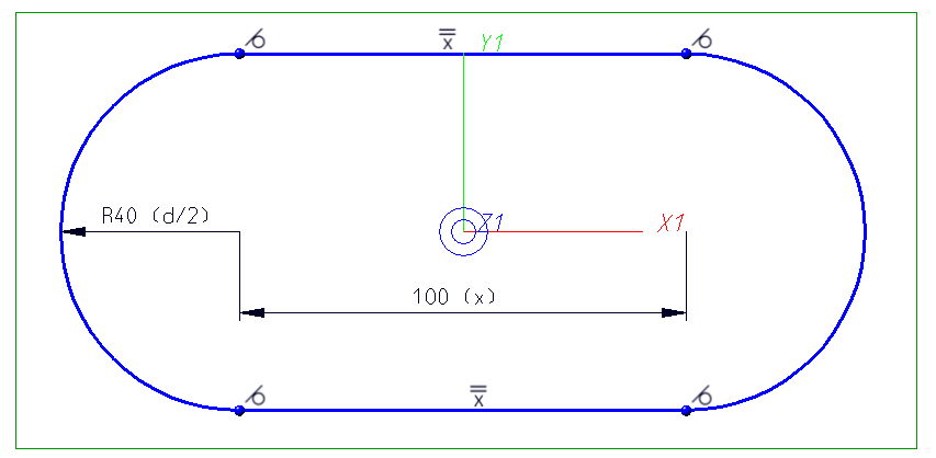 1. Zusätzlich enthält die Skizze einen benannten Punkt ! im Ursprung. Diesen fügen Sie über die Funktion Skizze > Neu > Punkt neu hinzu und bennenen ihn über die Funktion Punktnummer neu . Mithilfe des Punkts können Sie die Skizze mittels Gleichlage- und Abstandsbedingungen relativ zum Ursprung platzieren. Für den Abstand in X-Richtung geben Sie die Formel x/2+d/2 ein. Für den Wert der Variablen x geben Sie 100 ein.