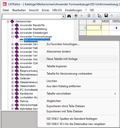 2. Wählen Sie den Katalog Werksnormen > Anwender Formwerkzeuge. Dort finden Sie bereits eine Tabelle ISD-Umformwerkzeug vor. Öffnen Sie die Tabelle mit einem Doppelklick, klicken Sie diese anschließend erneut mit der rechten Maustaste an und wählen Sie Neue Tabelle mit Vorlage.