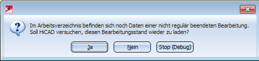 Wenn Sie nach einem Programmabbruch (z.B. mit dem Taskmanager) oder nach einem Programmabsturz HiCAD neu startet und in das HiCAD-Modul R+I-Schema wechselt, erscheint der Hinweis: