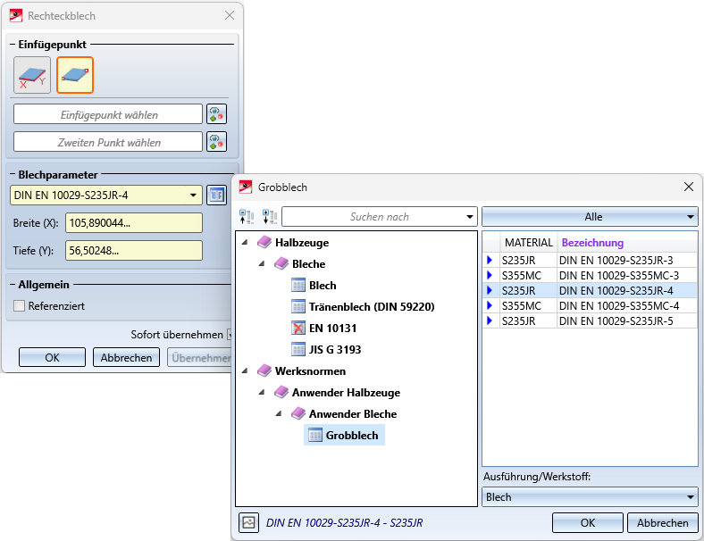 Unter Werksnormen > Anwender Halbzeuge > Anwenderbleche haben Sie im Katalogeditor die Möglichkeit, Tabellen mit eigenen Blechen anzulegen. Diese werden dann im Dialogfenster ebenfalls zur Auswahl angeboten.