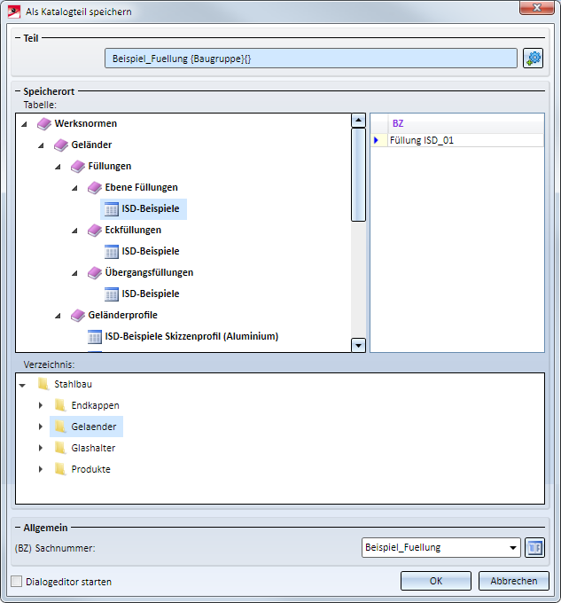 - Existiert zum gewählten Teil bereits eine Variante (maßgebend ist der Teilename), dann sind Eingaben im Dialogfenster Als Katalogteil speichern nicht möglich. Sie können aber den Dialogeditor starten und so (falls noch kein Dialog vorhanden ist) einen neuen Dialog anlegen oder den bereits vorhandenen Dialog bearbeiten.