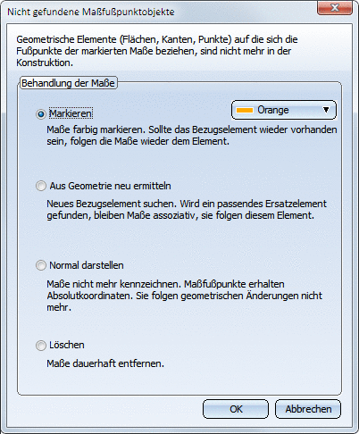 Maßfußpunkte beziehen sich auf geometrische Elemente, d. h. Flächen, Kanten oder Punkte. Werden diese Elemente aus der Konstruktion entfernt, dann verlieren die Maße ihren Bezug und sind nicht mehr assoziativ.In solchen Fällen kann die Funktion Maße aktualisieren nicht einwandfrei durchgeführt werden. Ist dies der Fall, dann werden die nicht aktualisierbaren Maße farbig markiert und es wird eine entsprechende Meldung ausgegeben: