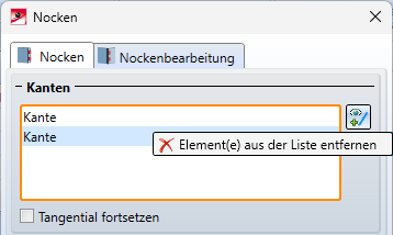 Im Bereich Kanten wählen Sie die Kanten aus, an der die Nocken eingebaut werden sollen. Sie können hier mehrere Kanten auswählen, die aber zum selben Teil gehören müssen. Um eine Kante aus der Auswahl zu entfernen, klicken Sie mit der rechten Maustaste auf den entsprechenden Listeneintrag und wählen die Funktion Element(e) aus der Liste entfernen. Um nachträglich weitere Kanten zur Auswahl hinzuzufügen, klicken Sie auf