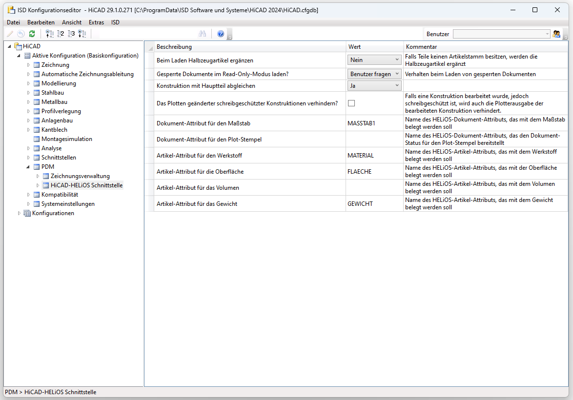 Im Konfigurationsmanagement (ISDConfigEditor) finden Sie unter Aktive Konfiguration (Basiskonfiguration) > PDM > HiCAD-HELiOS Schnittstelle einige Einstellungsmöglichkeiten zum Verhalten von HELiOS im Kontext von HiCAD.