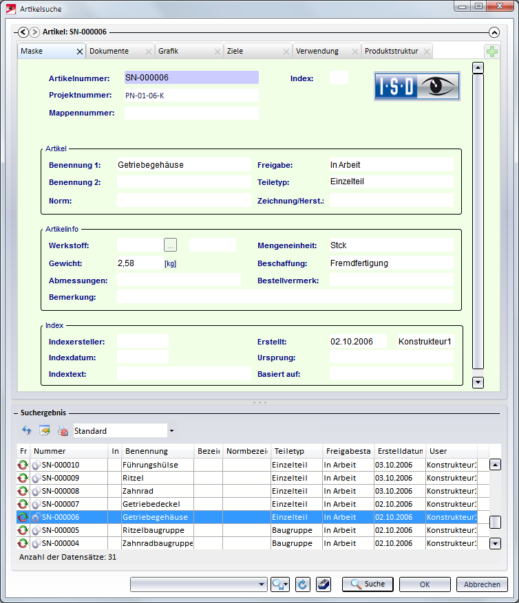 Mit dieser Funktion weisen Sie der Konstruktion über die Artikelsuche einen neuen Dokumentenstamm und vorhandene Artikeldaten zu. An dieser Stelle können Sie den gewünschten Artikelstamm auswählen und mit OK der Konstruktion zuordnen.