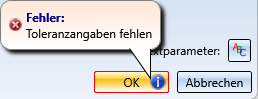 Sind die gewählten Einstellungen unvollständig oder fehlerhaft, dann wird dies am OK-Button gekennzeichnet. Wenn Sie mit dem Cursor auf das Symbol zeigen, wird eine entsprechende Meldung angezeigt.