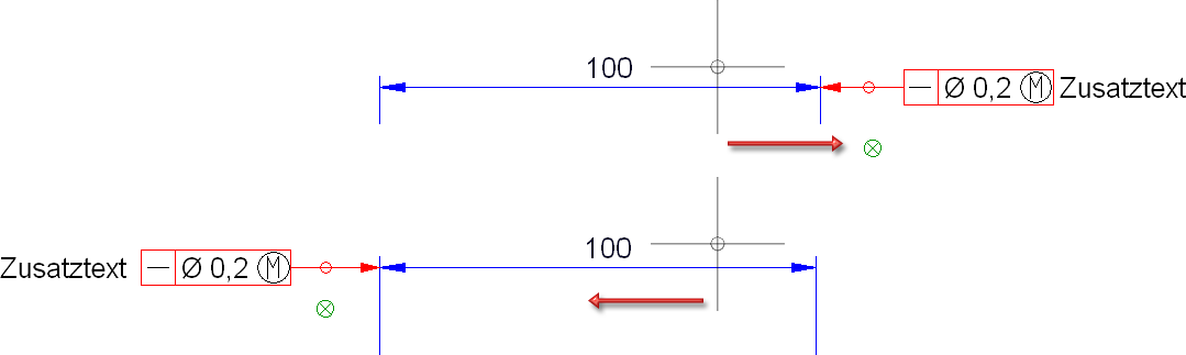 - Wird eine Toleranz an die Maßlinie eines Strecken oder Durchmessermaßes gesetzt, dann ist Fahne nicht mehr starr an der Maßlinie befestigt. Durch Draggen des Pfeils lässt sich der Bezugspunkt auch auf die andere Seite des Maßes setzen.