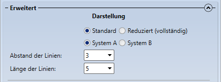 Bei der Darstellung der Schweißnaht können Sie zwischen der Standard-Darstellung (Maschinenbau) und der vereinfachten Darstellung (Stahlbau) wählen. Darüber hinaus können Sie die den Abstand und die Länge der Linien für die Schweißnahtdarstellung festlegen.