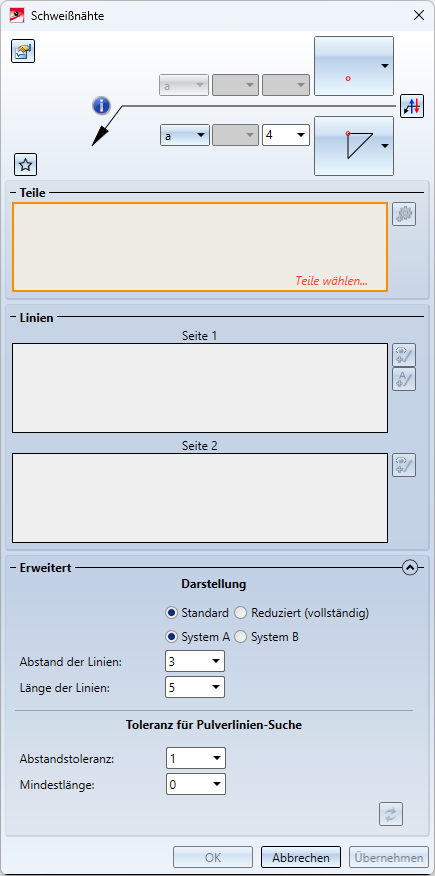 Auch während der Auswahl der zu verschweißenden Teile oder der Schweißnahtlinien lassen sich Werte und Symboleinstellungen im Dialogfenster ändern.