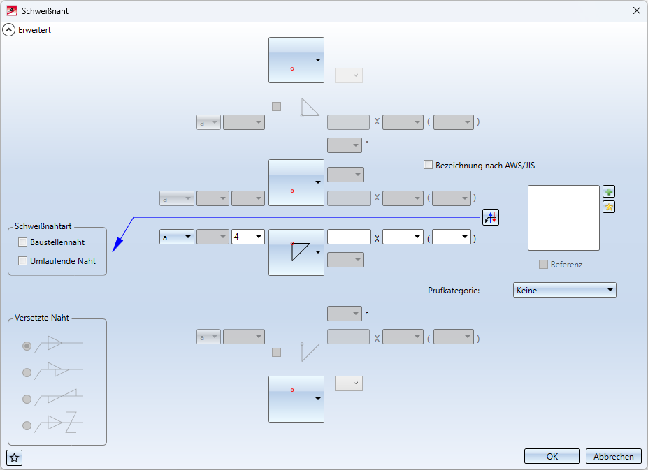 . Die Bedienung des anschließend angezeigten Dialogfensters erfolgt im Wesentlichen analog zur Funktion Freies Schweißsymbol, es stehen aber nicht alle dort verfügbaren Optionen zur Verfügung.