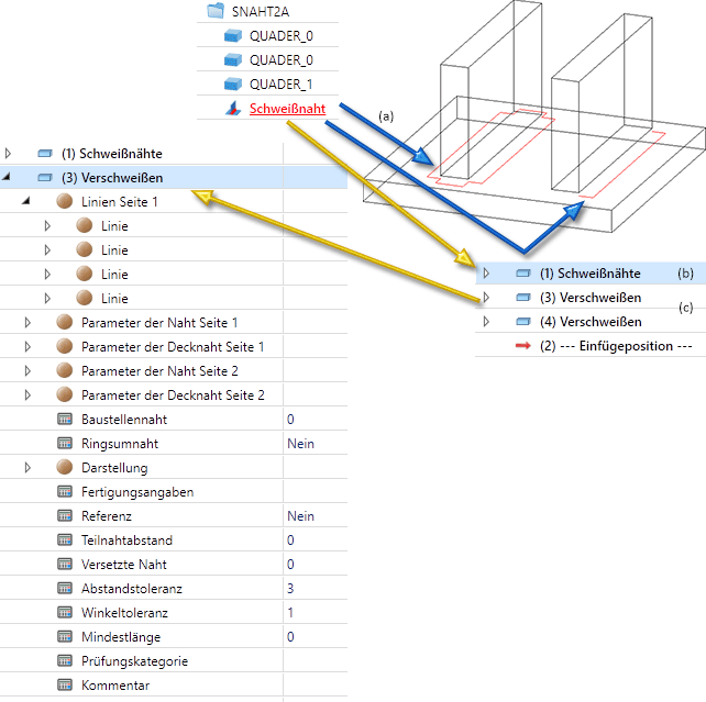 Im abgebildeten Beispiel sind zunächst - in einem Arbeitsschritt - die Schweißnähte links erzeugt worden. Dabei wurde das Hauptteil Schweißnaht (a) erzeugt. Anschließend ist bei aktivem Schweißnaht-Hauptteil die Schweißnahtfunktion erneut aufgerufen und die rechte Schweißnaht erzeugt worden. Das Featureprotokoll enthält dann das Erzeugungsfeature (b) und zwei Schweißnahtfeature (c), wobei im Beispiel das Feature (3) für die zuerst erzeugten Schweißnähte steht (daher auch vier Einträge unter Linien Seite...).