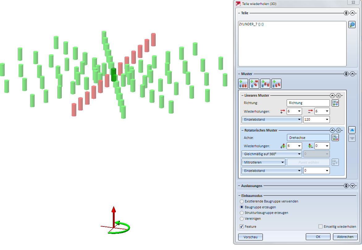 Der abgebildete Zylinder (Höhe 80, Durchmesser 30, Zentrum der Grundfläche liegt im Ursprung) soll zunächst durch lineares Verschieben in Y-Richtung 6 mal - sowohl in positiver als auch in negativer Richtung - kopiert werden. Anschließend sollen diese Kopien samt Original durch Rotation um die z-Achse 6 mal kopiert werden.