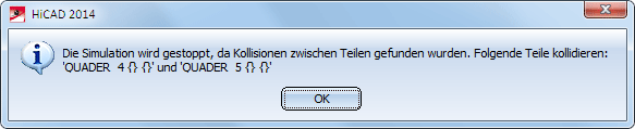 - Ist unter Einstellungen die Checkbox Berechnung bei Kollision beenden aktiv, dann wird die Berechnung der Bewegungssimulation bei der ersten Kollision zweier Bauteile beendet. In diesem Fall erscheint ein Dialog und die betroffenen Bauteile werden markiert.