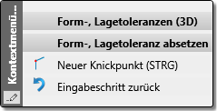 die Möglichkeit, Knickpunkte in die Hinweislinie einzufügen. Wenn Sie diese Funktion wählen, wird beim Drücken der linken Maustaste an der entsprechenden Stelle ein Knickpunkt eingefügt. Danach geht es mit dem Absetzen der Form-, Lagetoleranz weiter. Das heißt beim nächsten Klick der linken Maustaste wird das Symbol eingebaut, es sei denn Sie fügen weitere Knickpunkte ein.