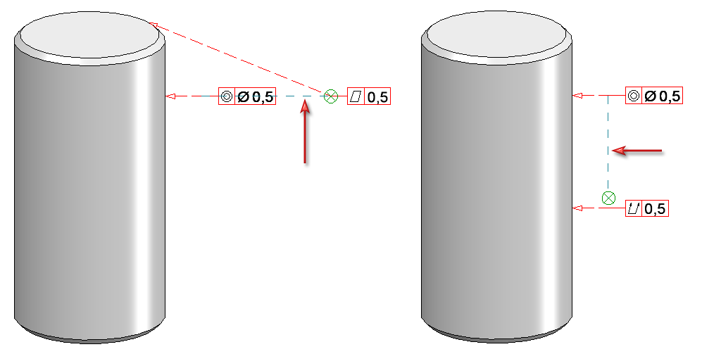- Wird eine Toleranz an die Maßlinie eines Strecken oder Durchmessermaßes gesetzt, dann ist Fahne nicht mehr starr an der Maßlinie befestigt. Durch Draggen des Pfeils lässt sich der Bezugspunkt auch auf die andere Seite des Maßes setzen.